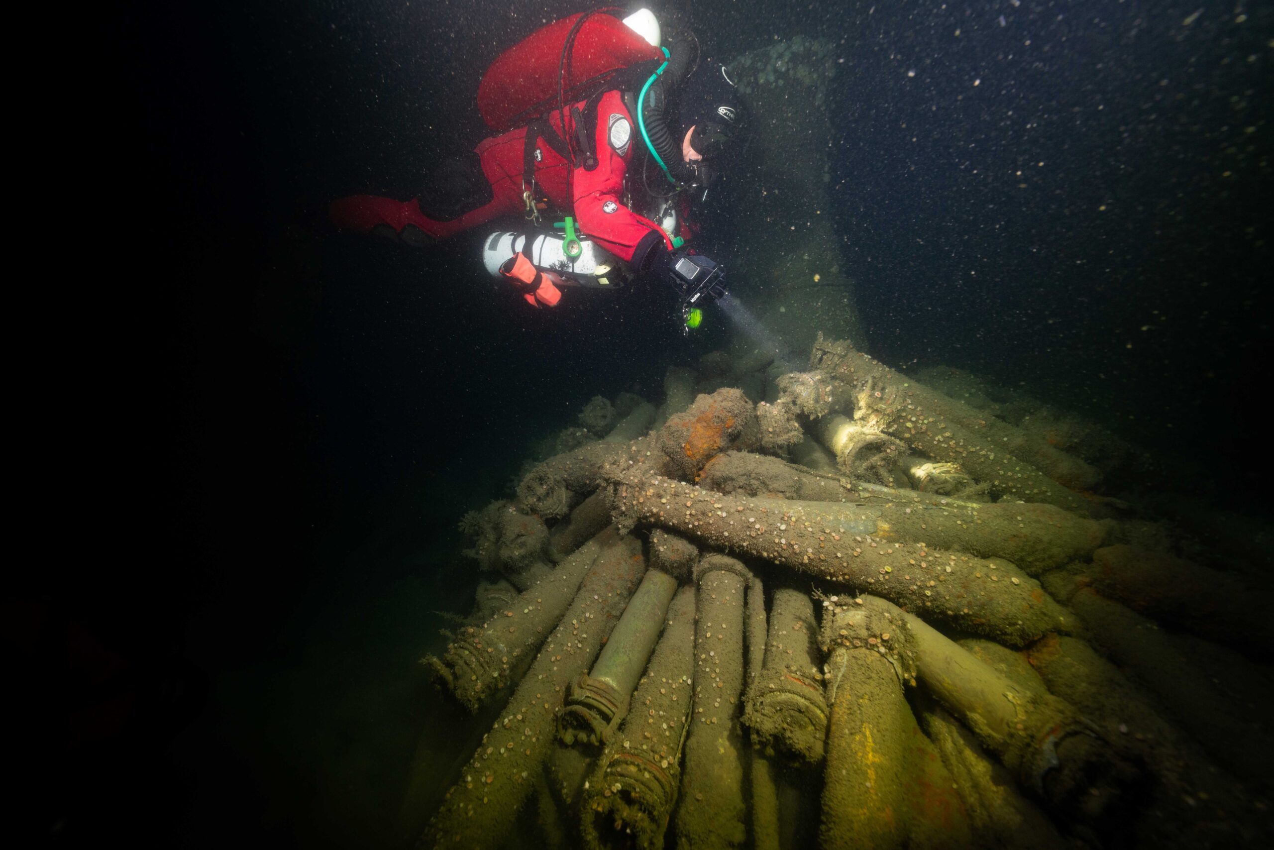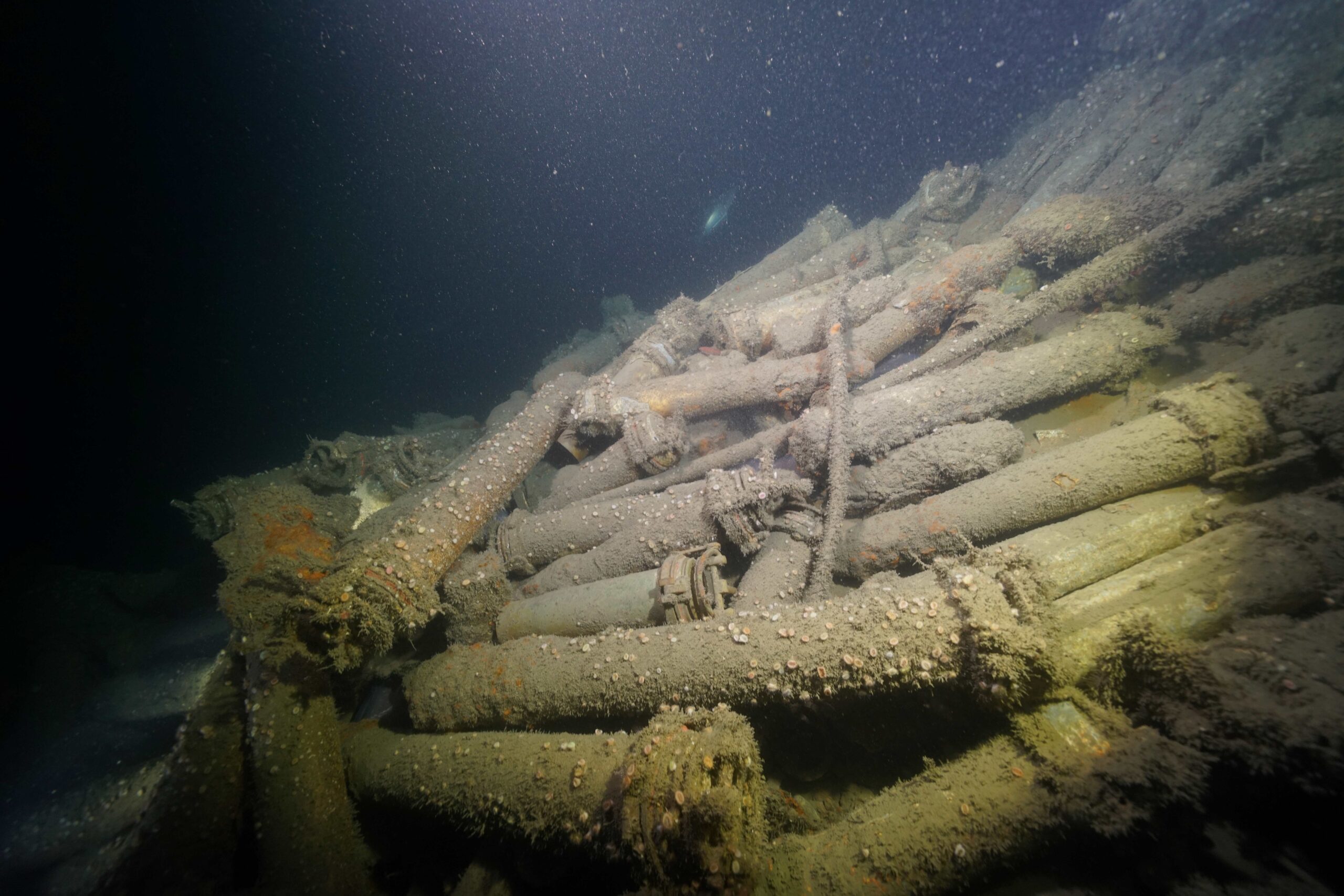 We vervolgden onze verkenning en zagen een van de torpedobuizen, die gemakkelijk te herkennen was. Vlakbij was ook een tweede toegangsluik, waarvan het sluitmechanisme duidelijk zichtbaar was. Er was nog een derde bronzen luik, maar dat stond in een hoek van 45 graden ten opzichte van het dek en werd gebruikt om nieuwe torpedo’s te laden tijdens het bijtanken. Ondertussen bleef ik foto’s maken, want het was duidelijk dat dit een bijzonder wrak was.