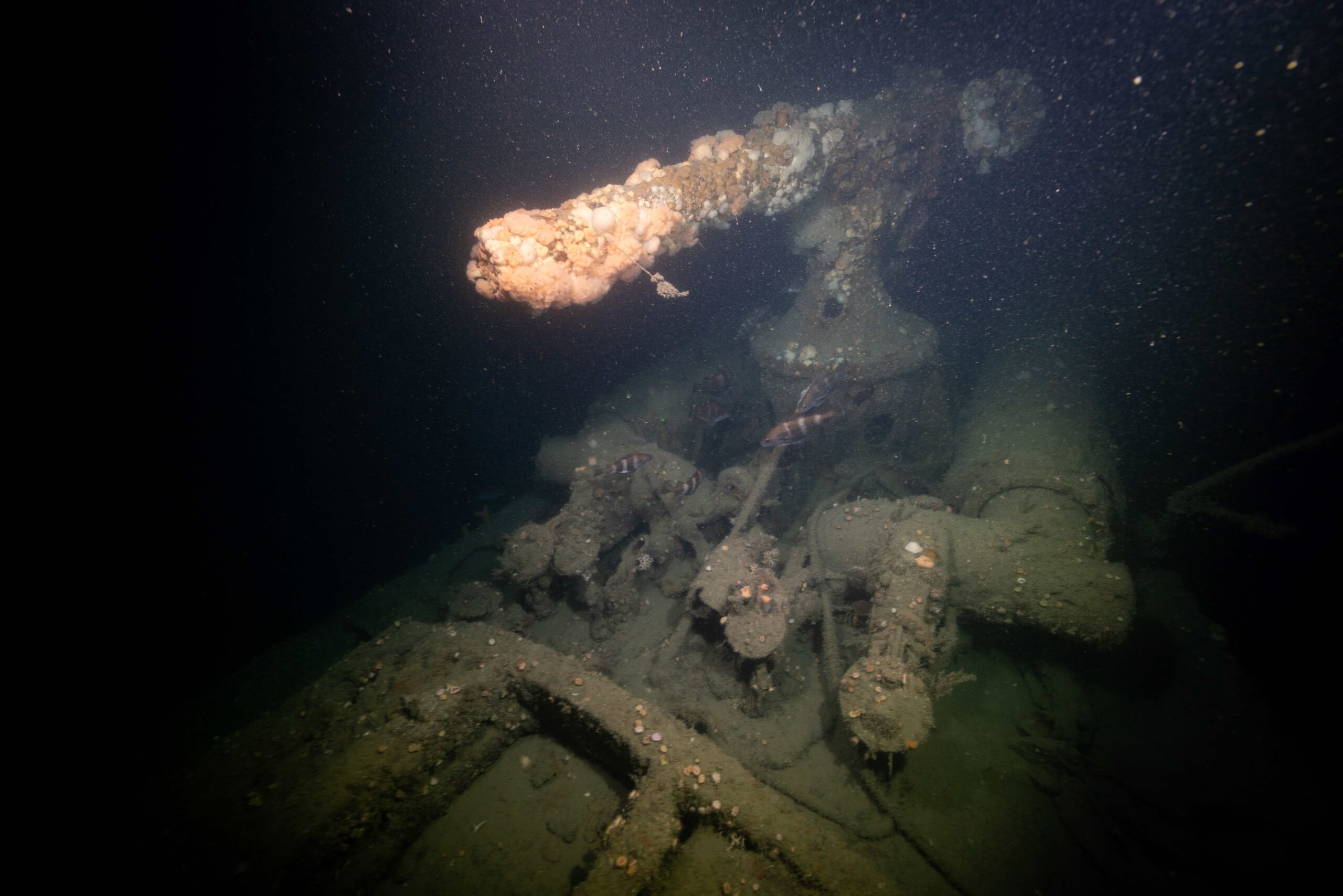 Toen we de bodem bereikten, was het zicht ongeveer zes meter en realiseerden we ons dat onze dreg niet op het wrak lag. Er was echter een kort sleepspoor in het zand en ik besloot in die richting te zwemmen. Gelukkig had mijn buddy zijn haspel aan de afdaallijn bevestigd, zodat we zeker waren dat we de weg terug zouden vinden. We hadden geluk en na een paar meter zwemmen zagen we de romp van het wrak voor ons liggen. We volgden de romp omhoog en voor ons stond het 88 mm kanon mooi rechtop op het wrak. Het kanon leek volledig intact te zijn.