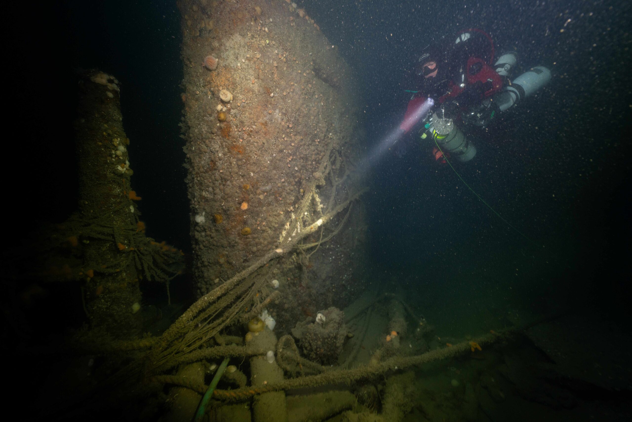Nadat we onze laatste controles hadden uitgevoerd, sprong ik als eerste van de boot en zwom naar de boei. Karl voegde zich kort daarna bij mij en we begonnen aan onze afdaling. Het wrak lag op een diepte van 82 meter. Op halve diepte bevestigden we onze naamplaatjes aan de lijn van het decompressiestation. Op een diepte van 65 meter bevestigde ik ook mijn stroboscooplamp aan de lijn, zodat we aan het einde van de duik zeker de opstijgingslijn zouden vinden.