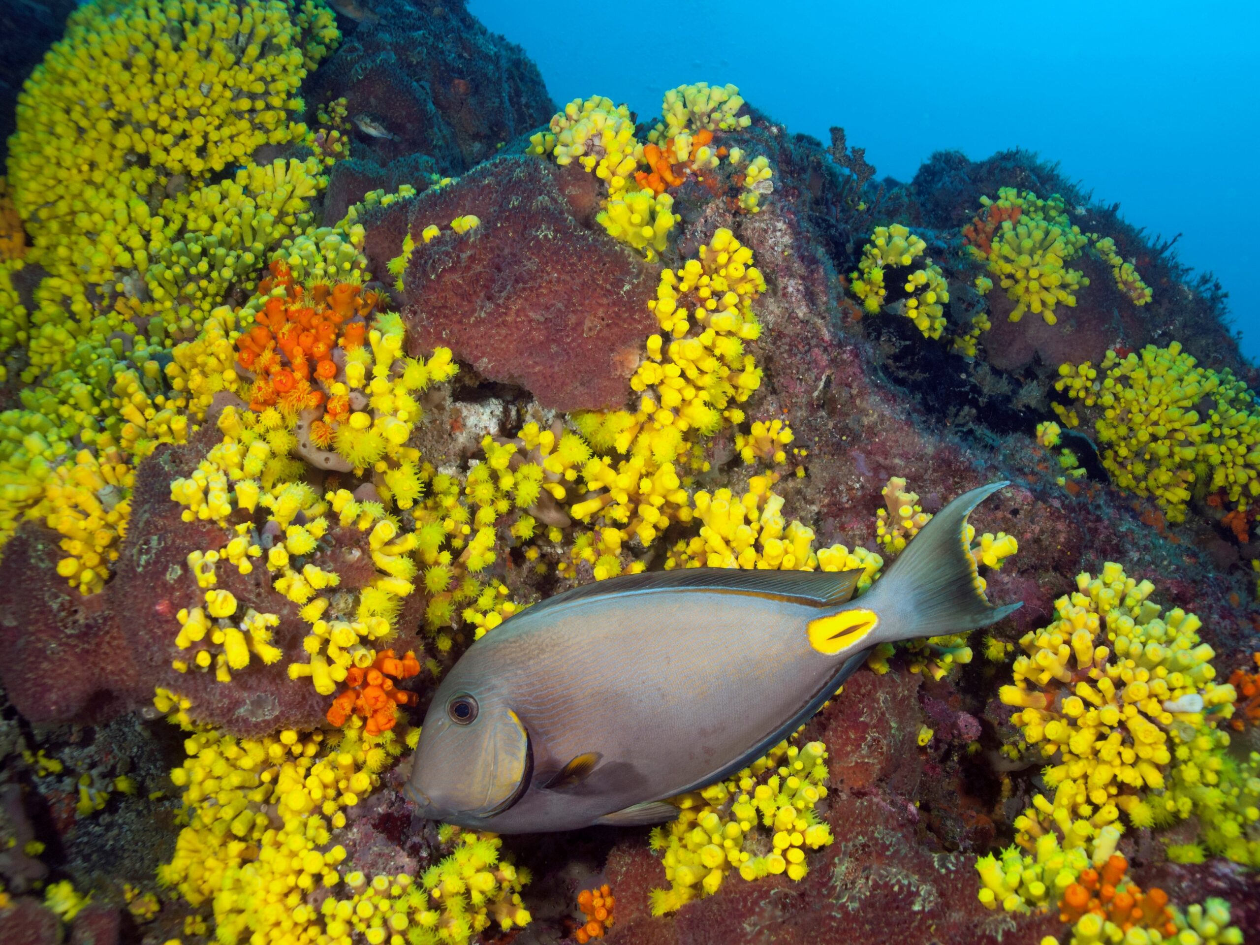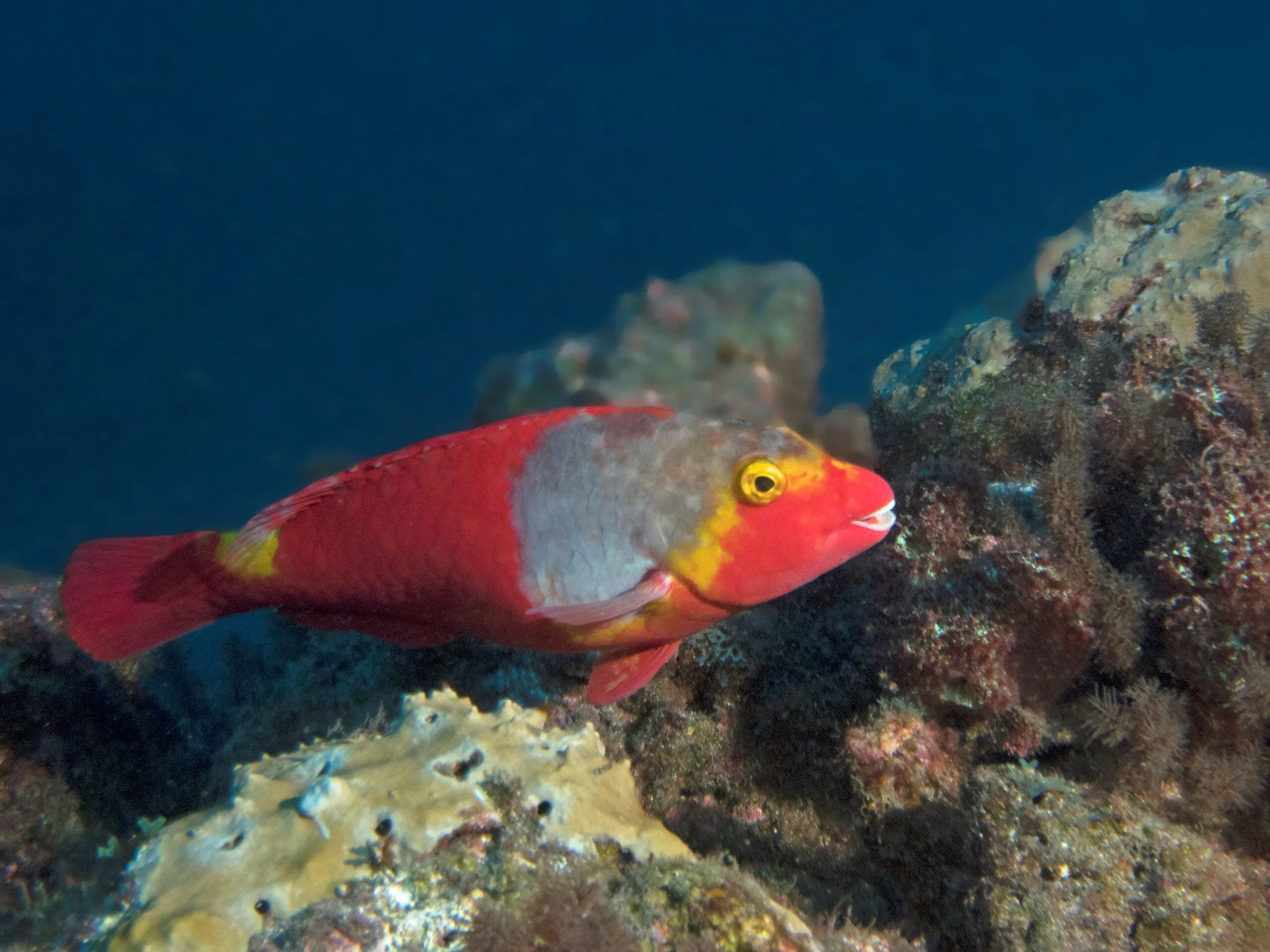 Die lipvis staat helaas ook op de rode lijst als ernstig bedreigd. Zelfs de doktersvis is een aparte soort, de Monrovia doktersvis, met een lichtblauw lichaam en gele accenten. Tijdens een diepe duik vonden we gorgonen, prachtig. De rode papegaaivis, dat is dan het vrouwtje, ik kan er niet genoeg van krijgen, is over het hele gebied te vinden. Nu is het vrouwtje een keer de mooiste, het grijze mannetje, ja, wat zal ik zeggen…