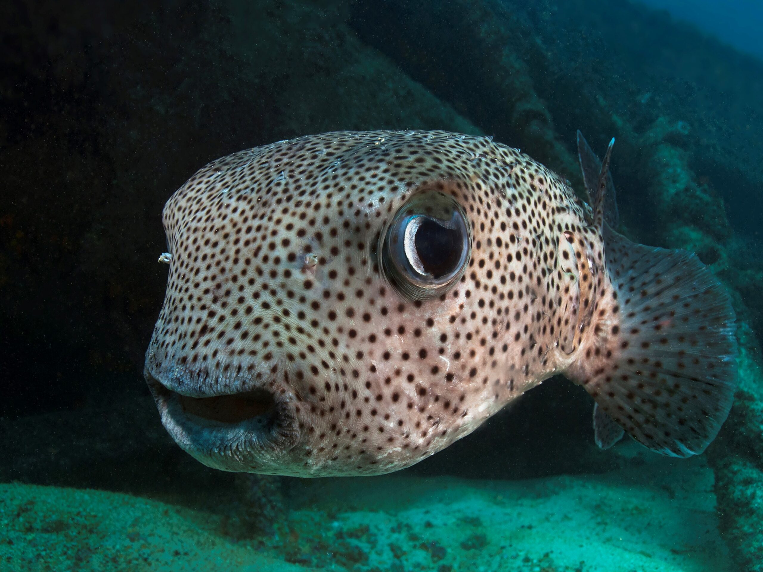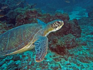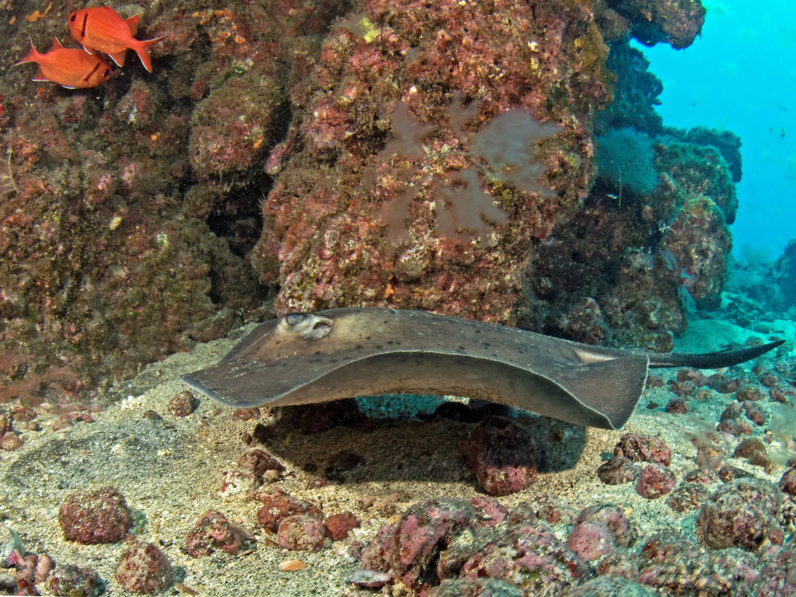 Ik vergeet bijna de groene schildpadden en de ronde stekelrog (grabata) en de Guinean snappers. Op een geheime plek met hier en daar wat rotsen zaten verpleegstershaaien te rusten. Nu hou ik niet van kleine ruimtes of om opgesloten te zitten, maar nieuwsgierig als ik was, stak ik mijn hoofd door een gat en daar lag ik ‘face to face’ met twee flinke dames verpleegstershaaien. Ik wist toen nog niet dat die ook behoorlijk kunnen bijten en schuifelde verder de grot in om mooie close-ups te maken. Gelukkig hebben ze me bijtijds aan mijn vinnen eruit getrokken!