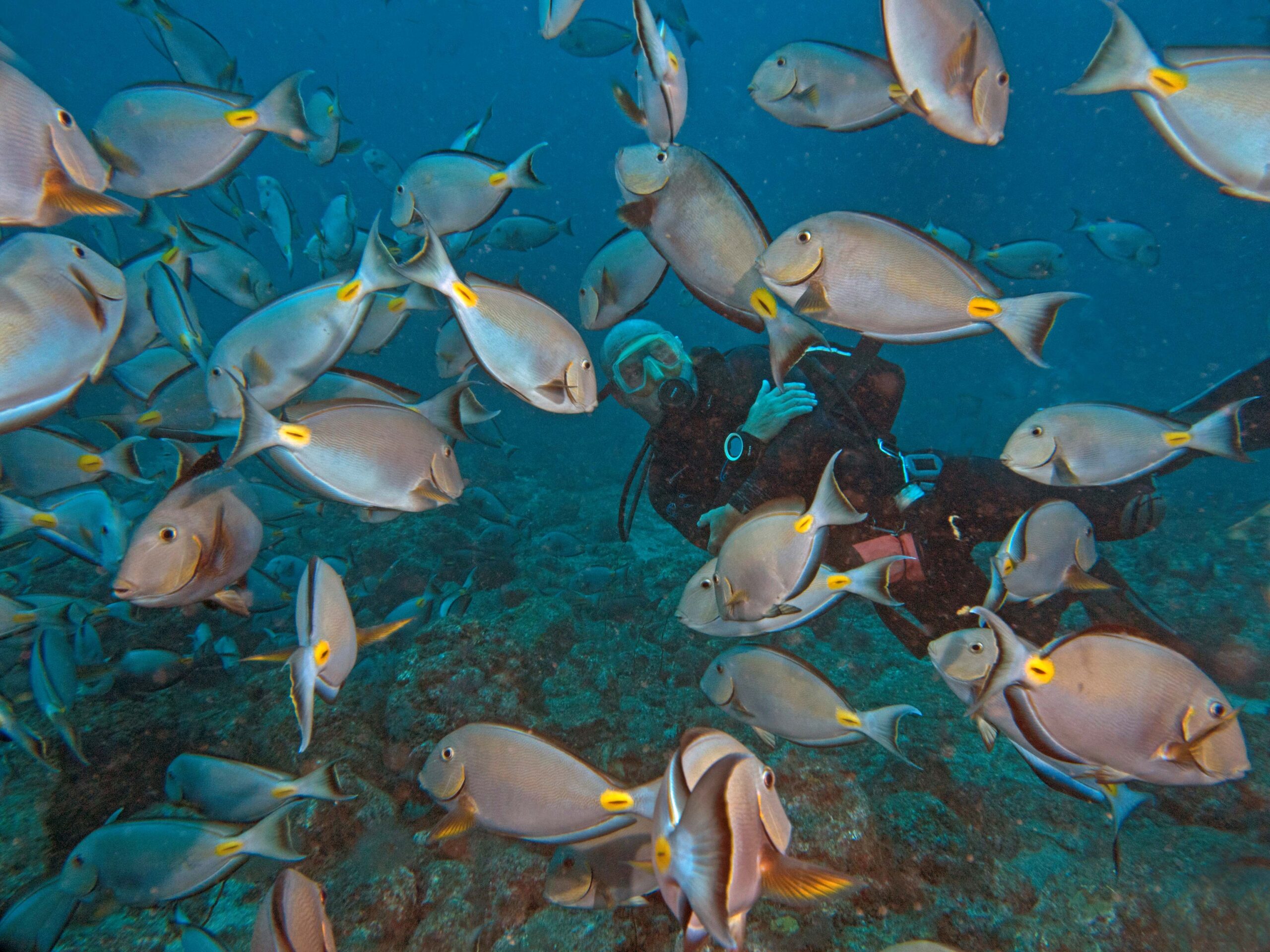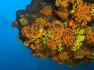 De schaduwkant van de rotsen zijn vaak begroeid met een soort koraal, met poliepjes. Het Tubastrea groeit graag in het donker, niet zo in het zonlicht. Het eerste dier wat mij mijn adem deed inhouden was de Afrikaanse keizersvis. Zo’n mooi visje, erg bijzonder, maar ook erg schuw. En de drieband vlindervis is ook een unieke soort, die alleen hier te vinden is. Ook de gewone eekhoornvis, de glasoogbaars en de gevlekte slangaal, de juffertjesvis en de soldatenvis zijn prachtige en opvallende vissen. Vergeet de zeebarbeel niet… De doktersvis is natuurlijk ook een endemische soort, bijna alle dieren zijn bijzonder.